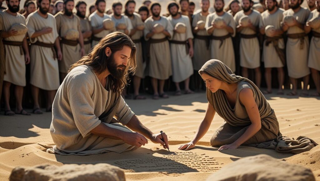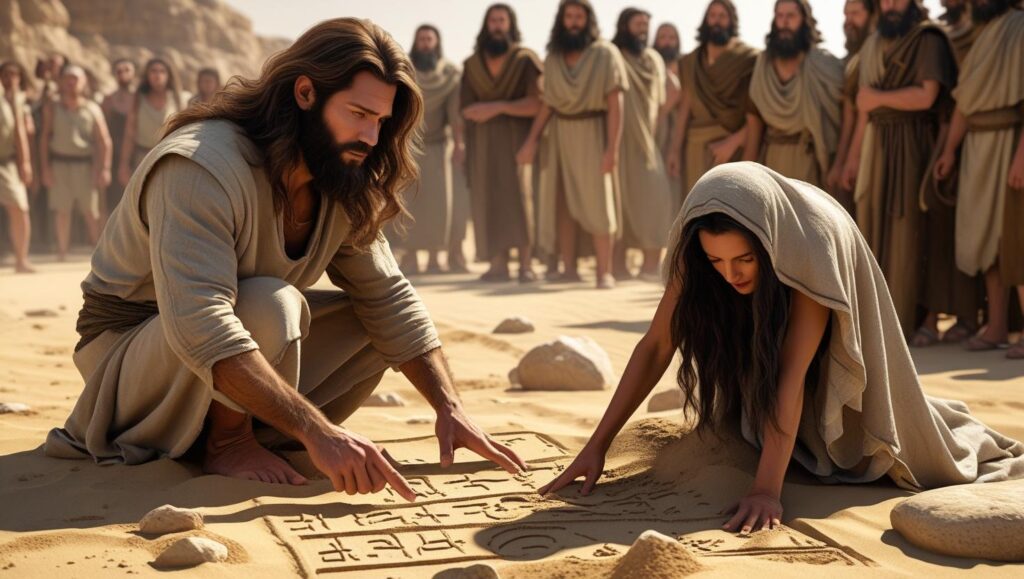 Entonces los escribas y los fariseos le trajeron una mujer sorprendida en adulterio; y poniéndola en medio, le dijeron: Maestro, esta mujer ha sido sorprendida en el acto mismo de adulterio. Y en la ley nos mandó Moisés apedrear a tales mujeres. Tú, pues, ¿qué dices? Más esto decían tentándole para poder acusarle. Pero Jesús, inclinado hacia el suelo, escribía en tierra con el dedo. Y como insistieron en preguntarle, se enderezó y les dijo: El que de vosotros esté sin pecado sea el primero en arrojar la piedra contra ella. E inclinándose de nuevo hacia el suelo, siguió escribiendo en tierra. Pero ellos, al oír esto, acusados por su conciencia, salían uno a uno, comenzando desde los más viejos hasta los postreros; y quedó solo Jesús y la mujer que estaba en medio. Enderezándose Jesús y no viendo a nadie sino a la mujer, le dijo: Mujer, ¿dónde están los que te acusaban? ¿Ninguno te condenó? Ella dijo: «Ninguno, Señor». Entonces Jesús le dijo: Ni yo te condeno; vete y no peques más.