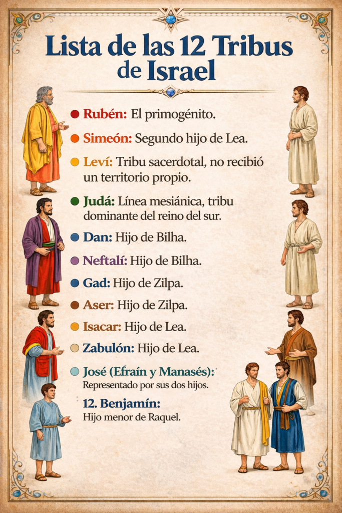 Nombres de los hijos de Jacob que llegaron a constituir las Doce Tribus de Israel: Rubén, Simeón, Leví (los levitas o tribu del sacerdocio), Judá, de la cual proviene Jesús, Dan, Neftalí, Gad, Aser, Isacar, Zabulón; la tribu de José es constituida por sus dos hijos, Manasés y Efraín, haciéndola una sola tribu; y finalmente el pequeño Benjamín.