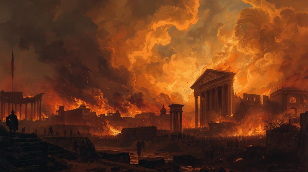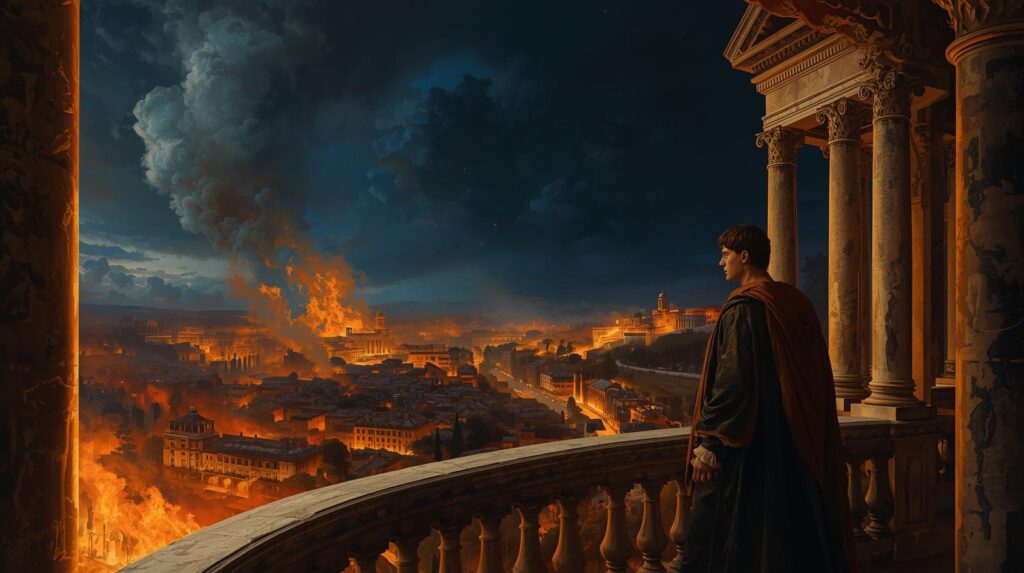 Nerón inició él mismo el fuego en Roma porque quería expandir su palacio, “La Domus Aurea”, y necesitaba esa parte del terreno para su proyecto constructivo colosal. Buscó una cabeza de turco para endosar el incendio.