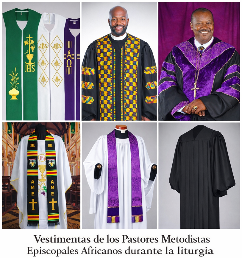 En la Iglesia Metodista Episcopal Africana, los pastores suelen vestirse durante la liturgia con una toga o túnica negra conocida como Geneva gown, que simboliza la sencillez y la tradición reformada del metodismo. Sobre esta toga, comúnmente llevan una estola que cuelga del cuello, cuyo color puede variar según el tiempo litúrgico (por ejemplo, blanco en celebraciones especiales o morado en tiempos de reflexión).