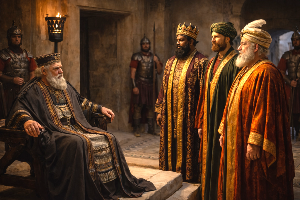 Herodes se entrevista con los Tres Reyes Magos y le dice que cuando encuentren el paradero del “Niño-Rey”, se lo comuniquen para que él también vaya a adorarlo. Solo una mentira más. El plan era matarlo. Pero los reyes, después de haber visto al Niño, regresaron por otro camino, nunca más dando información al rey Herodes del paradero del rey que había nacido.